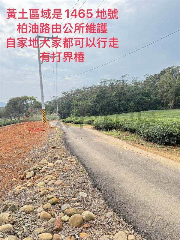 1.柏油路是公所養護,路寬約3米,汽車可到,2.現況出租給茶園,月租金5萬,租期到114.12.31日,3.1393.1465地號種茶葉,一年收益大約60-70萬,4.茶葉一年採收5次,以春茶和紅茶為主,5.附近有私人風水地,6.土地公告現值3650萬,現址賣2980萬,買到賺到