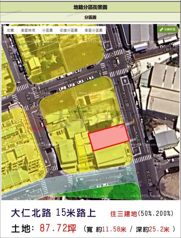 2.面寬約11.6米,深25.2米,87.72地坪,住三建地50/240。。