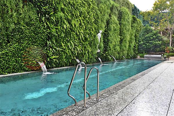 新古典鋼骨建築外觀,門前象徵圓滿如意的保和池,潺潺流泉湧入。