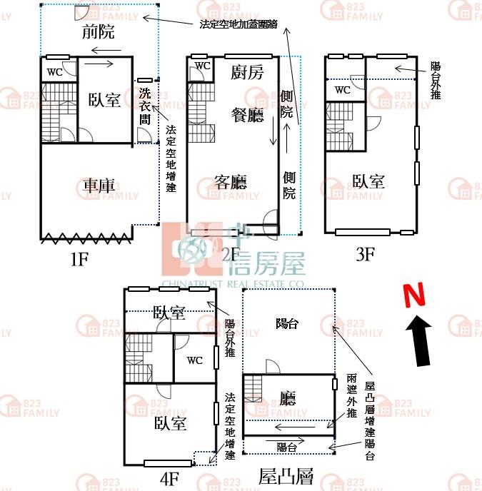5.自有車庫可停三車.二樓客餐廳有側院前院.三樓整層主臥.四樓2間房間.五樓露臺陽台