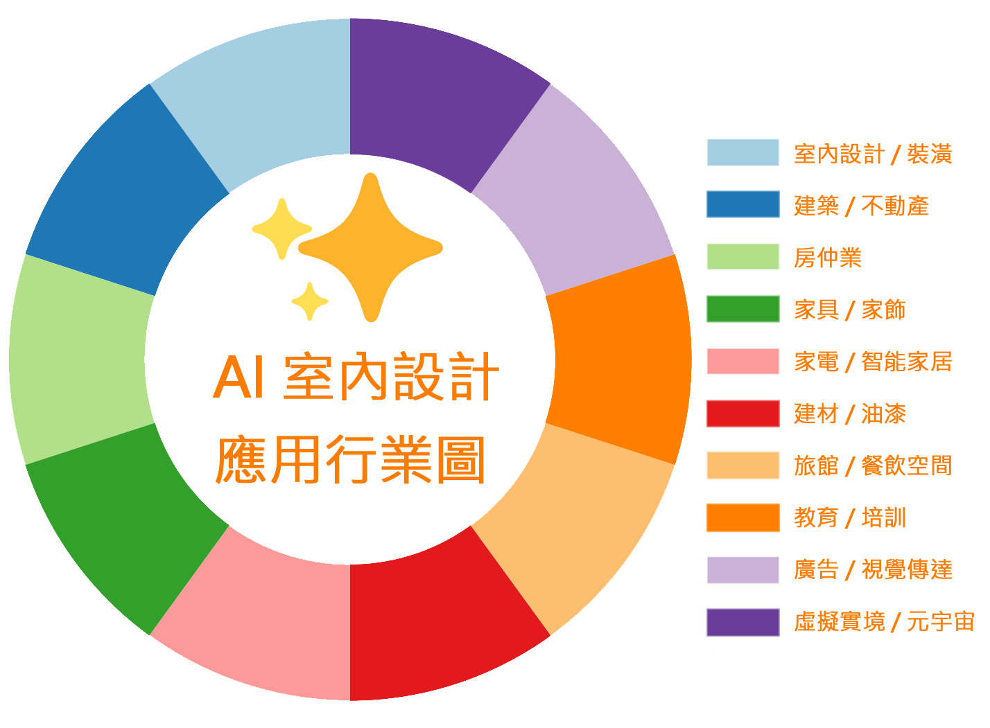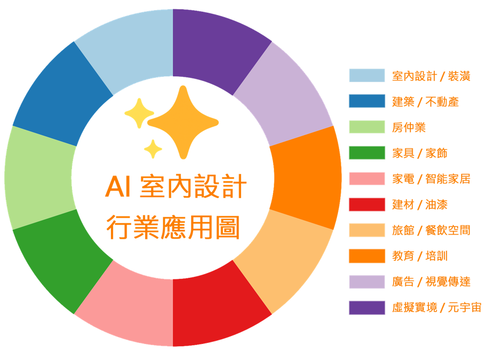 AI 室內設計不只是輔助設計師繪圖,它的應用跨越 "室內設計 / 裝潢", "建築 / 不動產", "房仲業", "家具 / 家飾", "家電 / 智能家居", "建材 / 油漆", "旅館 / 餐飲空間", "教育 / 培訓", "廣告 / 視覺傳達", "虛擬實境 / 元宇宙",核心價值在於降低設計成本、提升溝通效率、加速決策與成交。,故~房地產、建築、零售、家具、教育、廣告 等行業,都非常適合導入AI技術。