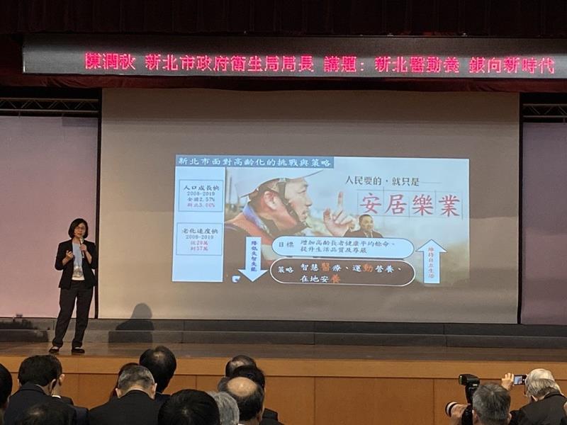陳潤秋則以「新北醫動養、銀向新時代」為主題。她說,新北市對於長照採取「醫」「動」「養」三觀點,醫是以網路代替馬路,透過網路、App延伸醫護,來破除城鄉差距;動則是推動新北動健康平台,並仿效北歐,建立40所樂齡公園,民眾並可下載新北「動健康」3.0 App來督促,讓長者一起運動;養則是推動新北好安居,如推動公共托老安居中心,四年內設置60家銀髮俱樂部,延伸到鄉鎮例如北海岸等新北共居圈。