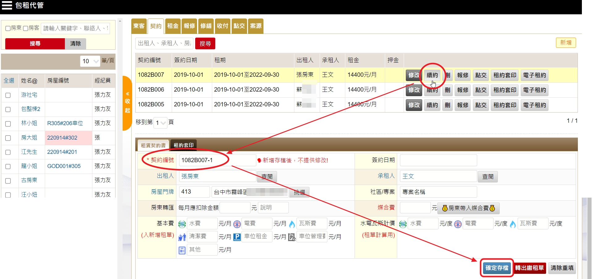 進入契約書>> 點擊【續約】,並編輯好契約書資料並【存檔】。