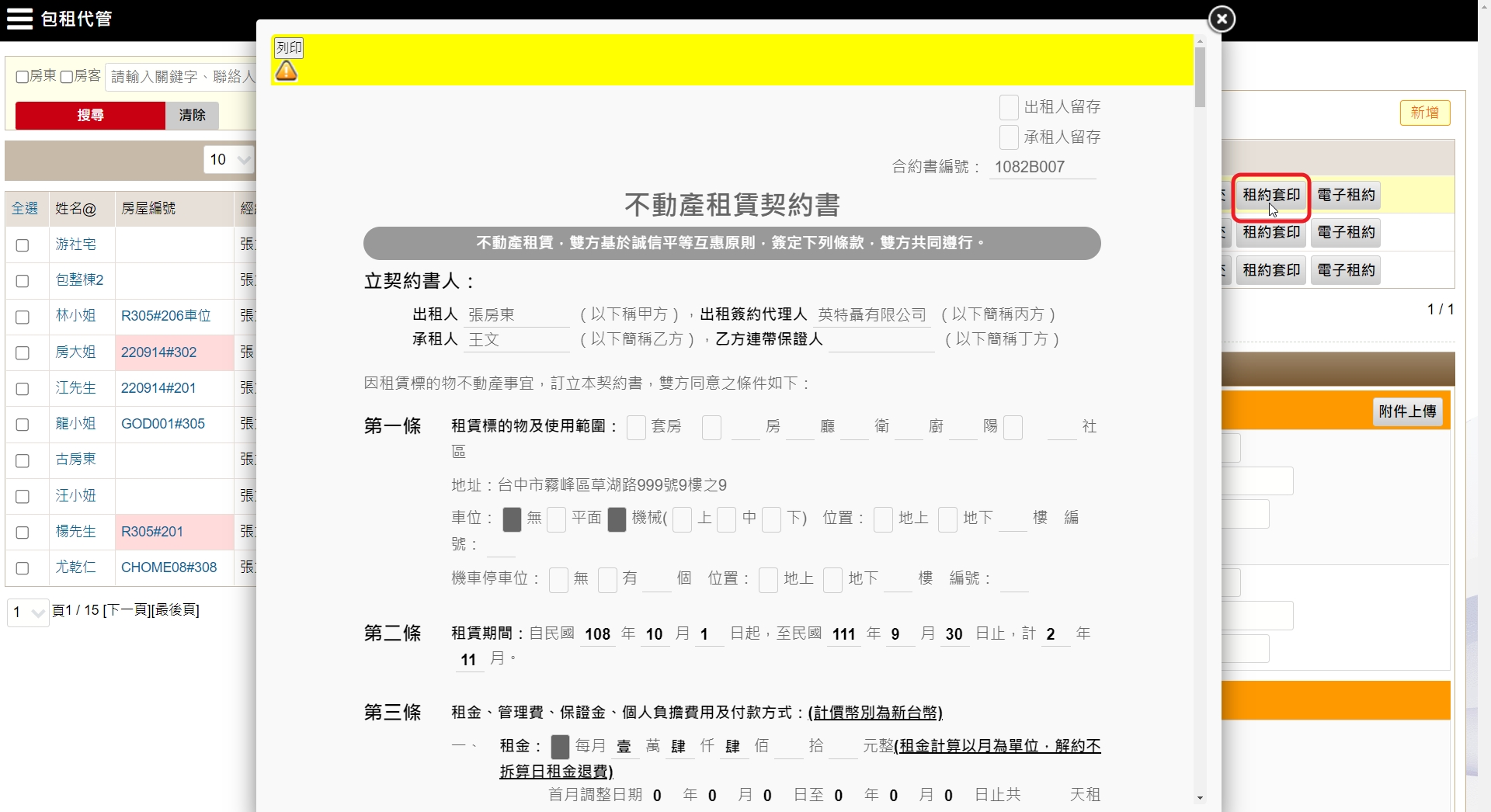 點擊列表上【租約套印】,並檢查契約書內容。